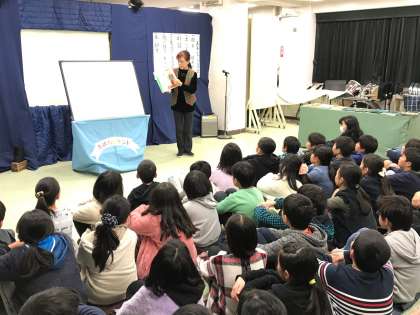 2クラスずつ視聴覚室に集まり、お話ランドに参加しました。