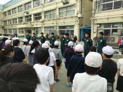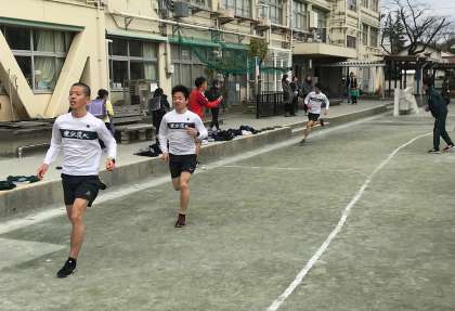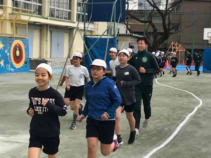 今日はお隣の農大陸上部の皆さんが、練習に励む5年生と一緒に過ごしてくださいました。給食を各教室で一緒に食べた後、クラスごとにウォーミングアップをし、1キロメートルの計測をしました。農大生が並走し、応援しながらペースメイクをしてくれました。お陰でベスト記録を、更新した子達もたくさんいました。