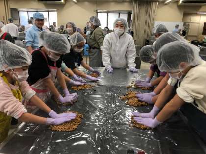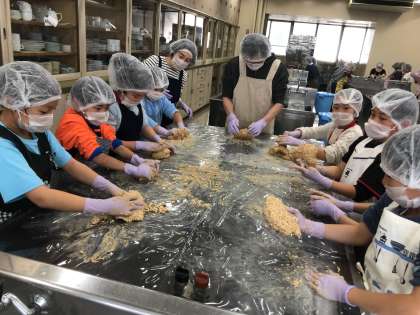 4年生の味噌作りも、その一貫です。毎年古庄先生のご指導で100キロ近いお味噌を仕込みます。前日に水につけてゆでた大豆に米こうじ、食塩を混ぜてつぶしていきます。大豆の粒がなくなるまでみんなで押しつぶし、ソフトボール大に丸めてしっかりと空気を抜いて、容器にたたきつけるように入れます。3か月じっくりとねかせるとお味噌が出来上がります。
