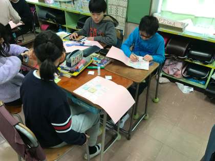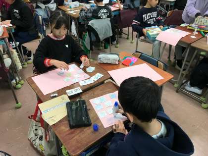 5年生の教室では先週から、仲良しタイムの班である活動をしています。全校児童の「卒業おめでとう」の気持ちを伝えるための、大事な役目です。詳細は…明日までのお楽しみ。