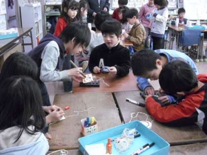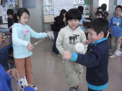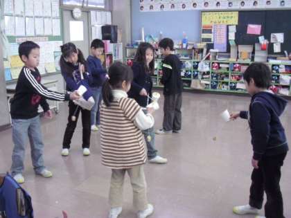 2年生は生活科の時間で「1年生と手作りおもちゃで遊ぼう」を行いました。「ビュンビュンごま」「けん玉」「マラカス」など、自分たちが工夫して作った手作りのおもちゃを、1年生にも教えながら作り、遊び方を教えていました。お兄さん、お姉さんとなり、1年生にもわかるように丁寧に説明し、実際にやってみせていました。1年生はとっても楽しそうでしたよ。2年生の優しさが教室にあふれていました。2年生ありがとう。