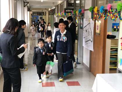 4/8 入学式その1 公開日 2019/04/09 更新日 2019/04/09 学年 始業式を終えると、6年生を中心に再び入学式用の会場設営をしました。その頃には雨も小雨になり、ピカピカのランドセルを背負った1年生が保護者の方達と登校してきました。 お出迎えするのは6年生です。受付後、靴を履き替え教室への手を引いてご案内しました。