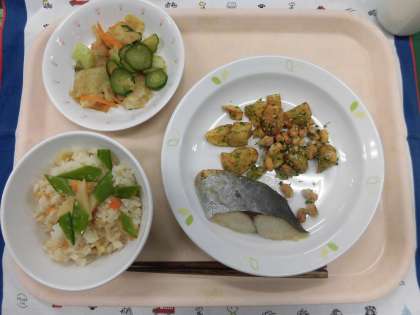 今日から給食が始まります。今日は、みなさんの進級をお祝いして、春が旬の新たけのこや鰆を使った、春を感じる献立にしました。