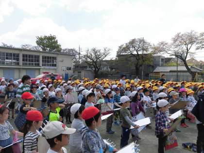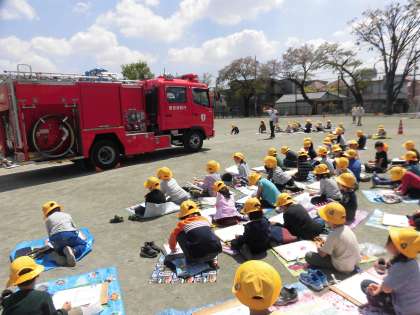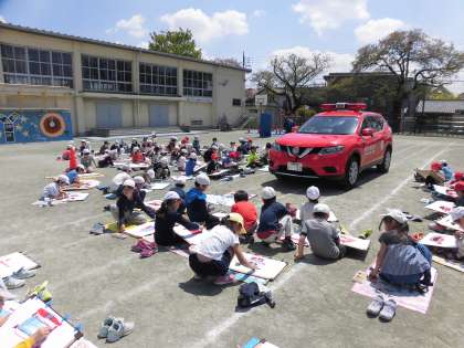 4/18 1・2年 消防写生会 公開日 2019/04/21 更新日 2019/04/21 学年 今日は玉川消防署の方の協力を得て、消防車を絵に描きました。はしご車とワゴン車の2台を間近で見て、 「赤以外の色もあるよ」「サイレンが鳴るのかなあ」など、たくさんのことに気がつきました。 1年生も2年生も暑い中、じっくり取り組むことができました。