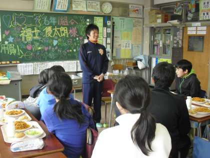 まず、各クラスに選手に入っていただき、給食を一緒に食べながらお話を聞いたり、質問に答えてもらいました。昼休みも一緒に遊び、交流を深めたあと、いよいよ開会式です。児童代表の言葉もとっても感動的でした。式後は、駅伝選手のリードでウォーミングアップ開始です。子どもたちは憧れの選手のもとでとっても楽しそうです。