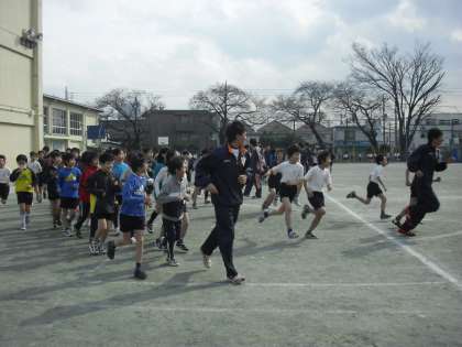今日は、日本体育大学駅伝部の選手に来ていただき、5、6年生と一緒に走ってもらいました。駅伝大会に向けて、一人一人が真剣に努力をしている姿を見て、「子どもたちのために何かしたい」と、元駅伝選手であった臼井副校長が企画し、駅伝部の協力があり実現したものです。