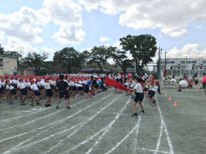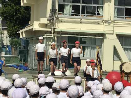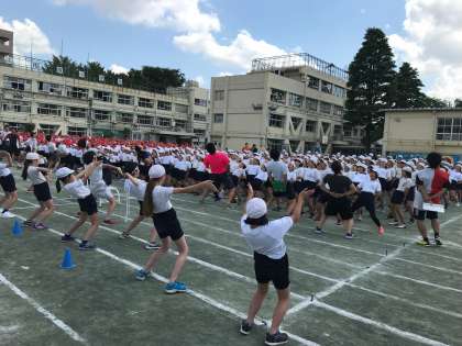 運動会を一週間後に控え、1回目の全校練習が行われました。今日は入場行進、開会式、応援、大玉送りの練習をしました。