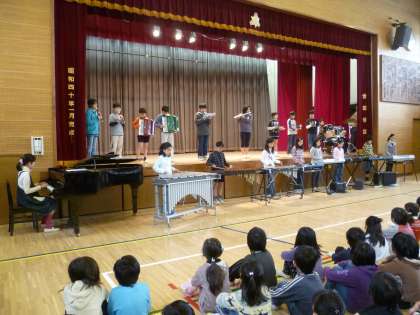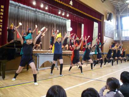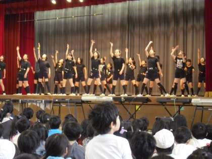 今日の集会は、音楽クラブ、民舞クラブ、ダンスクラブの発表です。音楽クラブは、嵐の「Believe」をさわやかに演奏しました。続いての民舞クラブは、エイサー「かりゆしの夜」、ダンスクラブは「キミハ ムテキ」を披露しました。エイサーでのやわらかさと力強さの入りまじった動きと、子どもたちが創作したリズミカルなダンスは、さすが用賀の子、真剣な瞳が素晴らしいの一言です。