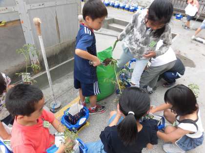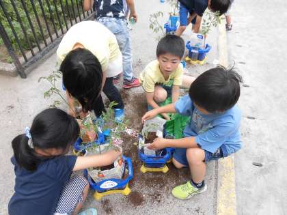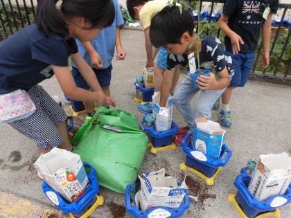 5/31 2年 生活科「ぐんぐんそだて」 鉢のミニトマト編 公開日 2019/05/31 更新日 2019/05/31 学年 畑に行った次は、自分の鉢にミニトマトの苗を植えました。牛乳パックでかさ上げをしてから、土を入れ、苗を植え、水をやる。子どもたちは一つ一つ丁寧に取り組みました。これから自分たちでお世話をして、収穫を目指します。学年みんなの鉢植えに、たくさん実がなると素敵ですね☆ 保護者の皆様、牛乳パックのご協力、ありがとうございました。