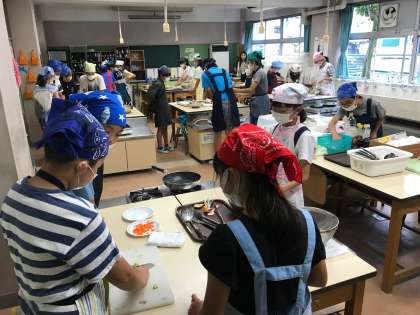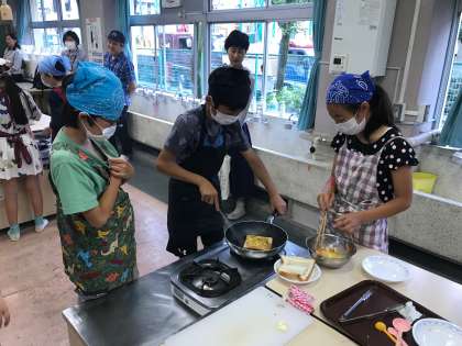 家庭科室では六年生が調理実習に取り組んでいます。フレームトーストの良い香りが漂ってきました。お味はいかに!?