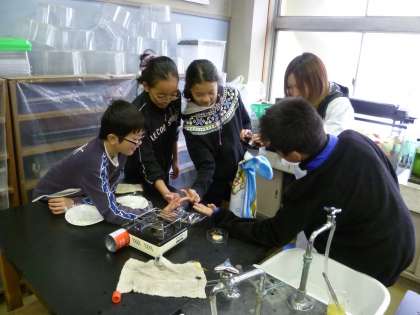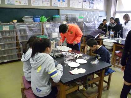 3/1 6年生の食育 公開日 2011/03/01 更新日 2011/03/01 校長室より 6年生の食育の授業は、食品添加物についての学習です。天然のジュースを使っての毛糸の染色や人口着色料での染色を実験しました。また、かまぼこの添加物としてのでんぷんについて、ヨウ素反応の実験をして確かめたりしました。 食品の添加物は、ものによってはとりすぎてはいけないものもありますが、必要なものもあるということを学びました。 東京農業大学短期大学部古庄教授と学生さん方のご指導に感謝いたします。