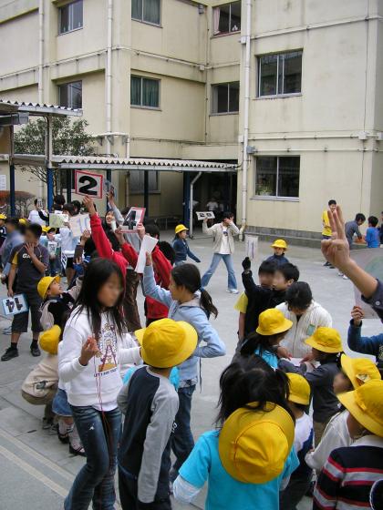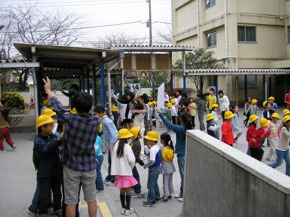 黄色い帽子をかぶったたくさんの1年生が次々に出てくるのを、6年生が手際よく自分たちの班に連れて行きます。