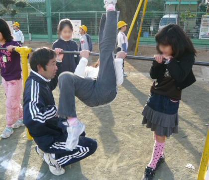 鉄棒は超満員。4年生が逆上がりの特訓を担任の先生としています。先生の膝にのって蹴り上げます。もう少しで成功しそうですね。