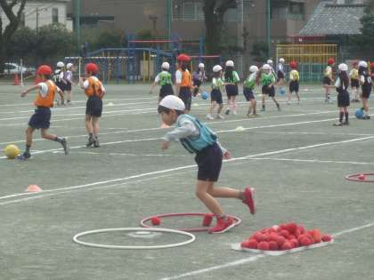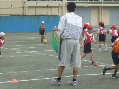 ボール蹴り遊びの運動の仕方や、注意することが書いてある紙のボードを見やすいように身体につり下げて指導して回っていました。