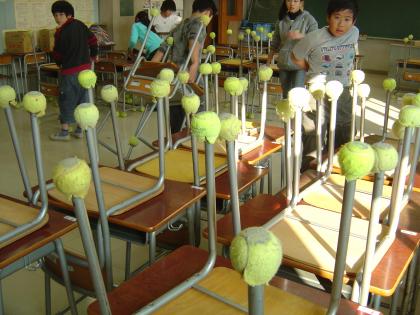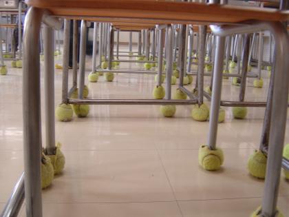 1年生から6年生までの全学年の子どもたちの机や椅子の脚にテニスボールが