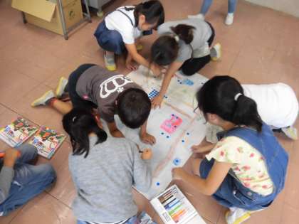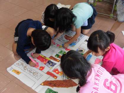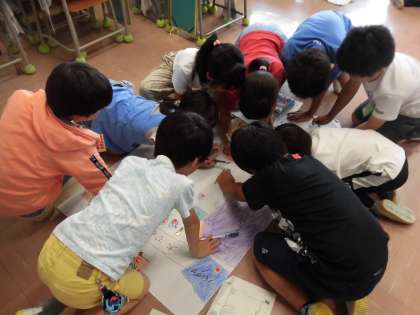 今日は先日行った町探検のまとめを行いました。各コースに分かれた後、用賀小学校を起点にどこに何があったのかを模造紙にまとめました。話し合いをしながら、また役割分担をしながら作り上げました。