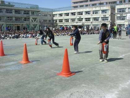 今日は、玉川消防署用賀出張所の方々にも来ていただき、消火器の使い方や実際に6年生の代表が練習をさせてもらいました。最後に避難訓練の様子を見ていた、消防署の方から「私語がなく、とても立派です」と誉めていただきました。玉川消防署用賀出張所の方々、ご多用の中をありがとうございました。