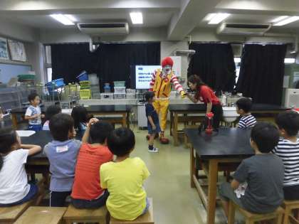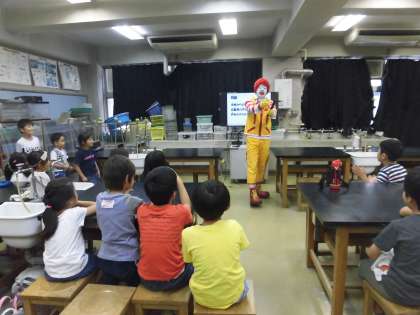 今日、用賀小学校にマクドナルドから、ドナルドさんが来てくださいました。
