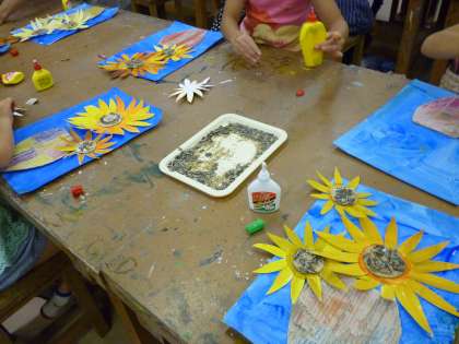 まずは、段ボールでできた花びんに好きな色をぬります。先生から「一色ではなくて、いろんな色をぬっていいよ!」と声をかけられ、思い思いに色をぬっていきました。次に、ひまわりの花の形をした画用紙に、絵の具で色をぬっていきます。子ども達の個性が発揮され、同じひまわりとは思えないくらい様々な色の花の完成です。花の中心には、なんと本物のひまわりの種や粟などをはりました。背景となる画用紙にスポンジやヘラで青をぬり、最後に花びんや花をはって完成です。