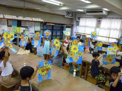 キッズアート教室では、リトルアートガーデンの北川先生と湊先生のご指導のもと、ゴッホの「ひまわり」を作りました。
