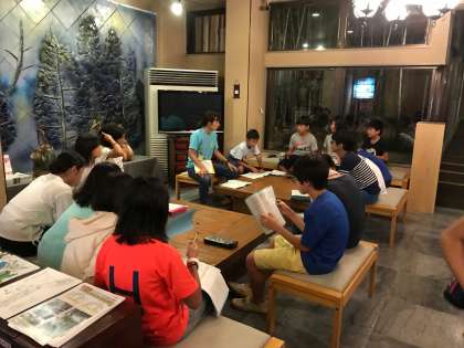 一日目の予定がすべて終了しました。班長が集まり、今日の振り返りや明日についての確認をしています。