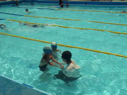 毎日プールに通っている子も多く、どの子も確実に泳力が高まっています。ピンク以上のコースでは、長い距離を泳ぐためには、のびのある泳ぎをすることが大切になります。先生からそのためにはどんなことが必要かを教えてもらいながら泳いでいました。また、泳ぎが苦手な子も、先生たちと一緒に潜って、頑張っていました。