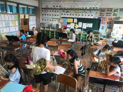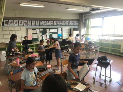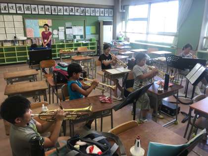 8/2 キッズバンド その1 公開日 2019/08/02 更新日 2019/08/02 学年 工事の都合もあり、今年の夏休みは各教室で練習をしています。 前半は楽器ごとに教室に分かれて、パート練習に励んでいます。上級生が下級生と関わり合いながら練習する姿は素敵です。