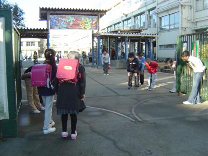 校門では、あいさつチームの元気のよいあいさつが響きます。