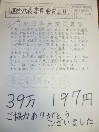 先日、児童会の代表が、私のところに「震災で被災した方々のために何かできることはないだろうか・・・」と言いに来た話を掲載しましたが、今日、形となって現れました。