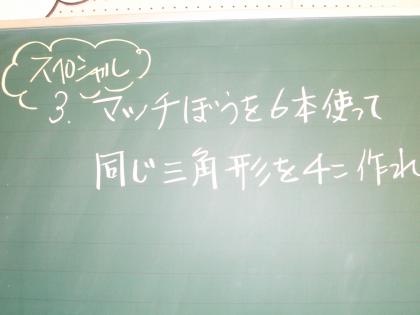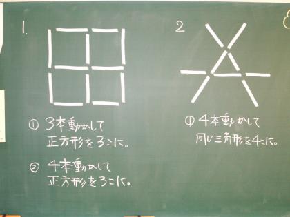 12/14 たのしい算数!!その1 公開日 2007/12/17 更新日 2007/12/14 学年 4年少人数算数は今日、2学期最後の授業でした。 算数ルームでは、最後に算数クイズをしました。マッチ棒クイズです。 頭が固い人も、やわらかい人も、みんなで頭をかきかき頑張りました。 こんな問題です。