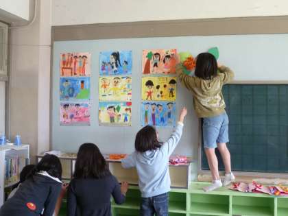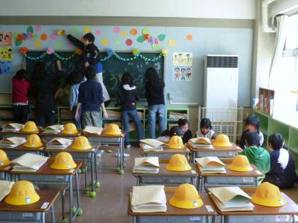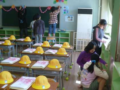 新1年生の教室は、6年生が心を込めて飾り付けてくれました。机の上には、教科書や、黄色い帽子が並びます。