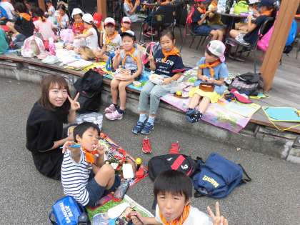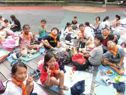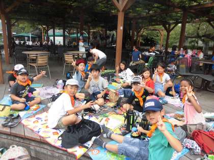 椅子を使うグループや、下に敷物を敷いて食べるグループなど様々でしたが、おうちの方に用意していただいたお弁当やお菓子も食べて、元気いっぱいになった子どもたち。午後の動物観察も、頑張れますね♪