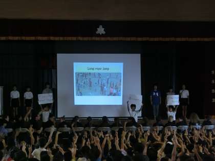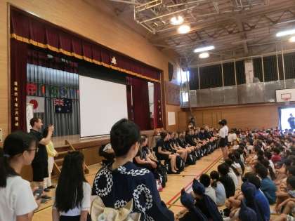 バンバリー市の子どもたちを迎え、運営・代表委員会で歓迎会を運営しました。司会進行や用賀小学校の紹介、クイズ、あいさつを英語を交えながら行いました。