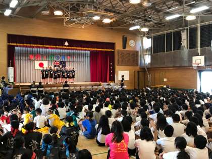 運営代表委員会、オリパラ委員会を中心に準備を進めてきました。運営代表委員会による、用賀小学校の説明の後は、日本の踊りとして3年生がエイサー、4年生は花笠、5年生はソーランを代表の児童が踊りました。