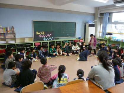 校庭では、長縄跳び、鬼ごっこ、ドッジボール、教室での遊びも工夫しています。とにかく、朝一番に、先生も一緒、クラスの友達も一緒の楽しい時間を過ごします。