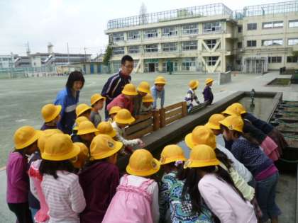今日の2時間目に1年生が校庭の探検をしました。校長室の前を通って池の鯉に挨拶です。とり小屋の前では「先生、用賀小学校では、どうしてニワトリをかっているのですか?」という質問がありました。