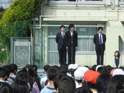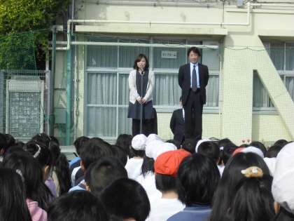 今日の全校朝会では、新任の栄養士、大脇先生と、今年度、東京教師養成塾の塾生で、1年間用賀小学校で、先生になるための勉強をしていく遠竹先生と葦名先生を紹介しました。どうぞよろしくお願いいたします。