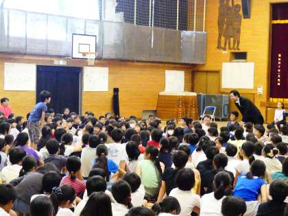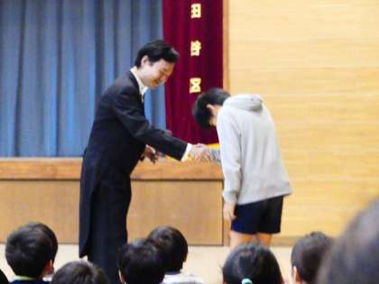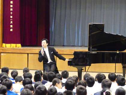 今日の3、4校時はピアノレクチャーコンサートで、ピアニストの竹内英仁さんをお迎えしました。演奏を聴くだけでなく、作曲家について、作品についても教えていただきました。体育館はコンサート会場になりました。ポロネーズとは、ポーランドの行進曲であり、おどりの曲でもあることを知り、またポロネーズのリズムに合わせて王子様やお姫様のように歩く経験をさせてもらうなど、子供たちは楽しそうでした。モーツアルトの「きらきら星変奏曲」ショパンの「子犬のワルツ」など5曲を聴かせていただき、最後はアンコールに「乙女のいのり」の演奏、そして質問にも答えてくださいました。ピアノからたくさんのことを学ばれたそうですが、ショパンの本を読んで国語力を高められたこと、外国での生活で料理やおかし作りも得意となったお話など、ためになったことでしょう。