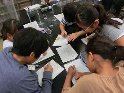 丸底フラスコ、実験用ガスコンロなどをグループのメンバーで