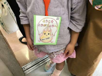 お家の方と一緒に、長い時間よく頑張りました。胸には5年生からのメッセージカードをさげています。