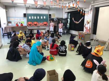 想い想いに仮装グッズを持ち寄り視聴覚室へ。英語支援員の方々が、ラガーマンとポップコーン姿で迎えて下さいました。装飾も可愛らしいです!