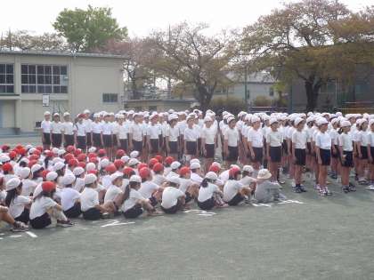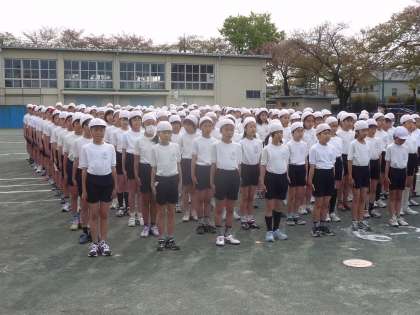 今日の体育朝会から、1年生が参加します。今年度最初の体育朝会ですから全学年共通の集団行動の練習をしました。