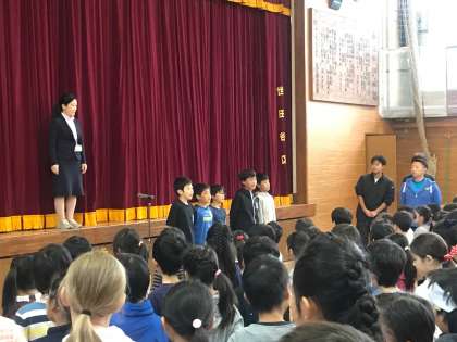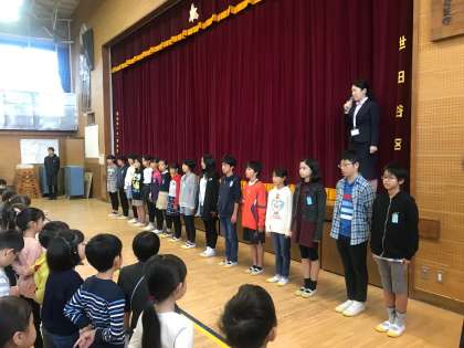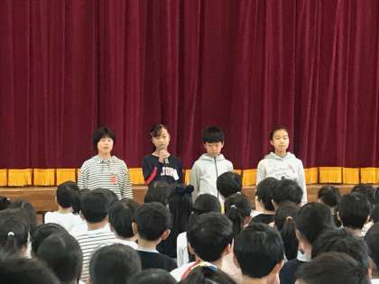 この日は6年生が参加する連合行事についてお話がありました。世田谷区水泳記録会で入賞した児童が紹介されました。
