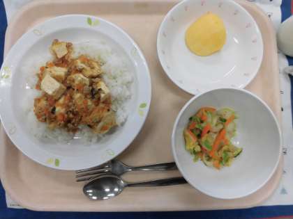今日の給食は、中華料理の「家常豆腐」です。そこで今日は、「家常豆腐」のクイズを出したいと思います。家常豆腐の「家常」とは、どういう意味でしょうか?