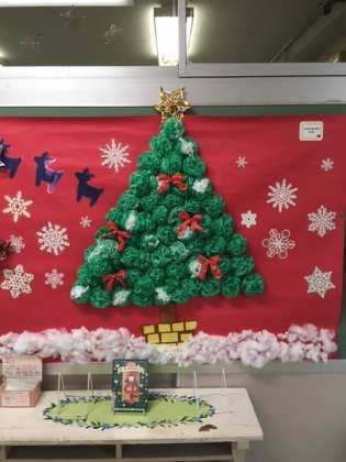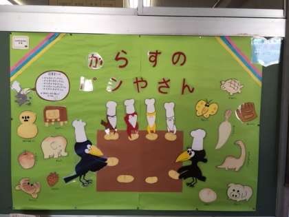「クリスマスツリー」は、子どもたちが楽しみにしているクリスマスの様子が素敵です。「からすのパンやさん」は、1階主事室前に、「クリスマスツリー」は、図書室前に飾られているので、ぜひ見てください。