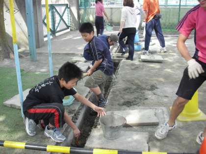 今日は、おや児の会、PTA教職員、卒業生が集まり校庭の側溝清掃と、投躑板のペンキ塗りをしました。8時30分におや児の会会長、PTA会長のの挨拶後、過去最高と思われる総勢110名以上の方々が一気に側溝の蓋を開けて、掃除を始めました。先日の雨を含んだドロドロと重たい土でしたが、皆さんの力の結集により、短時間で10時00分には終了することができました。
