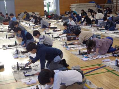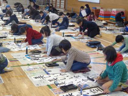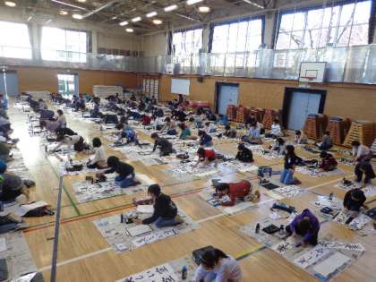 本日、体育館で席書会を行いました。少し肌寒い中でしたが、子ども達は静かに集中して取り組みました。文字のバランスやとめ・はね・はらいなどに気をつけながら、練習した力を発揮していました。
