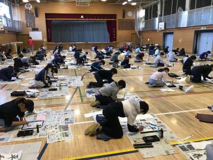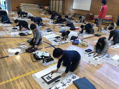 1/10 6年 書き初め 公開日 2020/01/10 更新日 2020/01/10 学年 二学期の終わりから練習を始めた書き初め。体育館に全員が集合し、「平和な春」の文字を書きました。冬休みの練習の成果を発揮することができました。 子供達と共に、一角では担任も筆を持ち題字書きにチャレンジしました。明日からは学校公開期間です。六年生に取っては最後の学校公開。大勢の参加をお待ちしています。