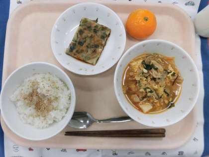 毎月19日は、食育の日です。食育の日には、「給食で世界を飛び回ろう!〜東京オリンピックに向けて、世界各国の料理に触れよう〜」ということで、いろいろな国の料理を出しています。クイズです。今日の献立は、どこの国の料理でしょうか?