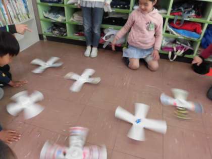 完成するとそれぞれ色を塗ったり、羽のデザインを変えたりしました。自分のオリジナルのこまを作り、みんなで回して遊ぶことで楽しく学習することができました。